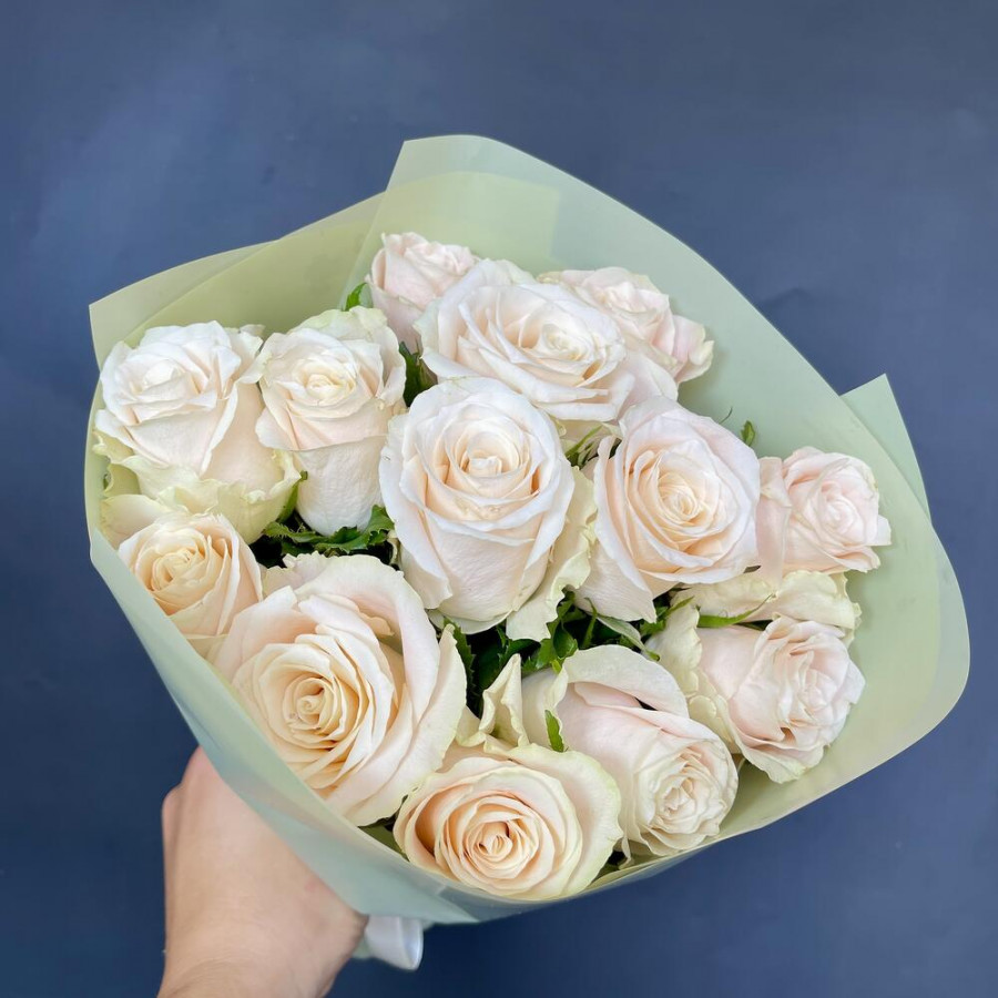 На фото букет из 13 кремовых роз. В составе: роза 13 шт, дизайнерская упаковка 1 шт, атласная лента 1 шт, . Все цветы свежие и ароматные, букет красиво оформлен и отлично подходит для подарка. Доступна доставка цветов или самовывоз.