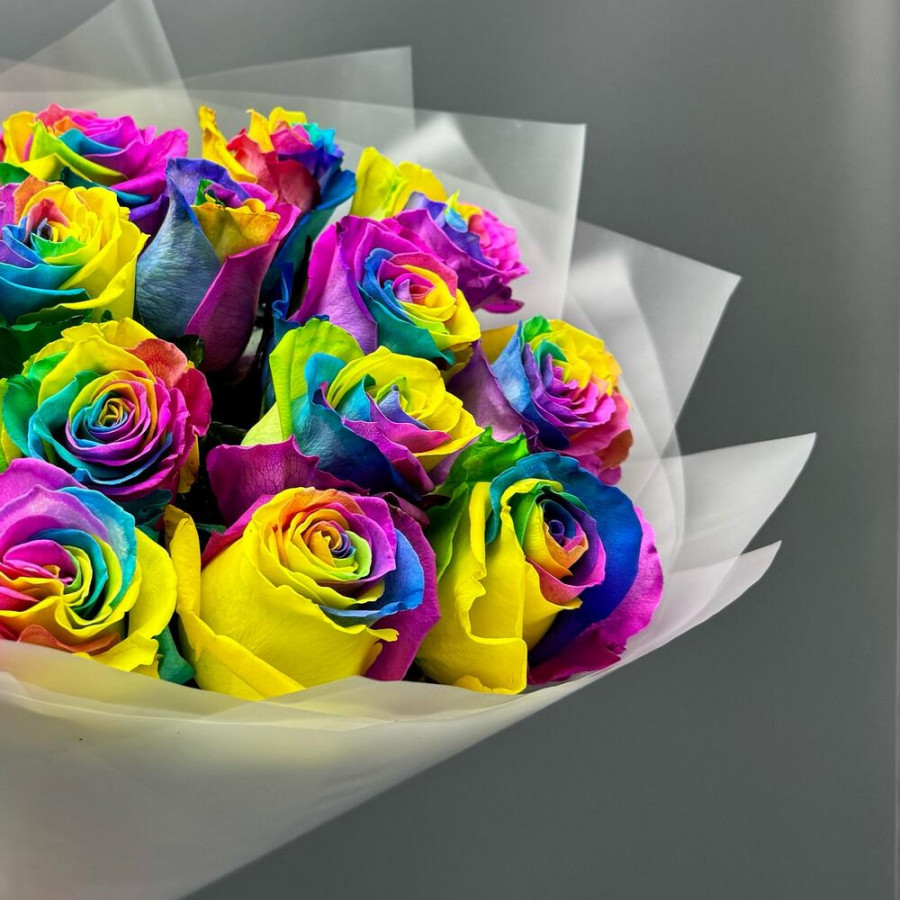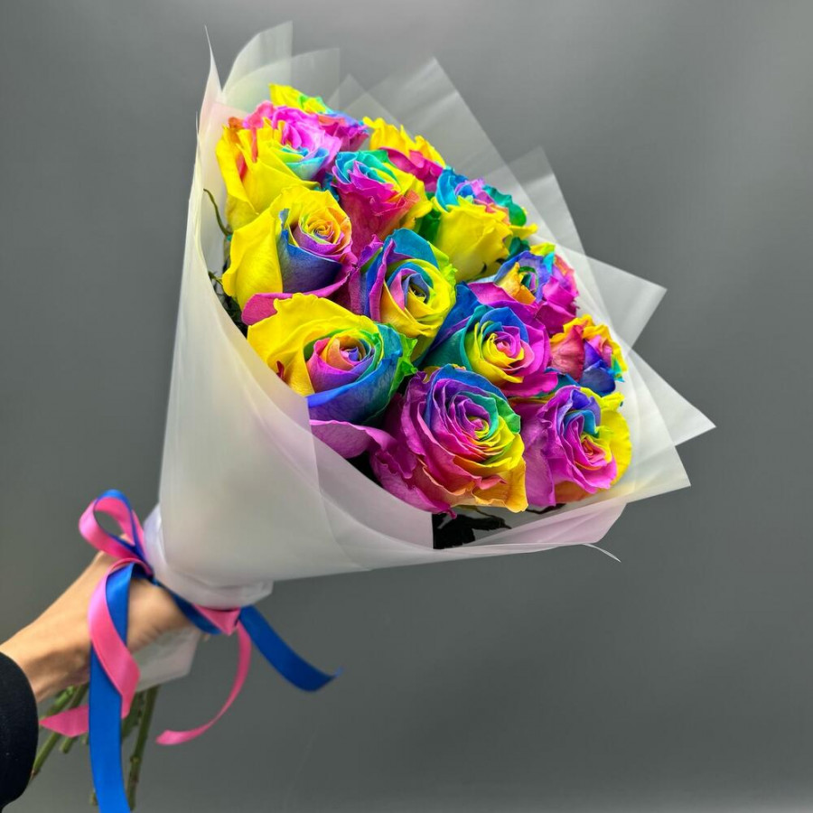 Лента атласная - 3 шт. Кризал (подкормка) - 1 шт. Открыточка с вашими пожеланиями - 1 шт. Дизайнерская упаковка - 1 шт. радужные розы - 15 шт.