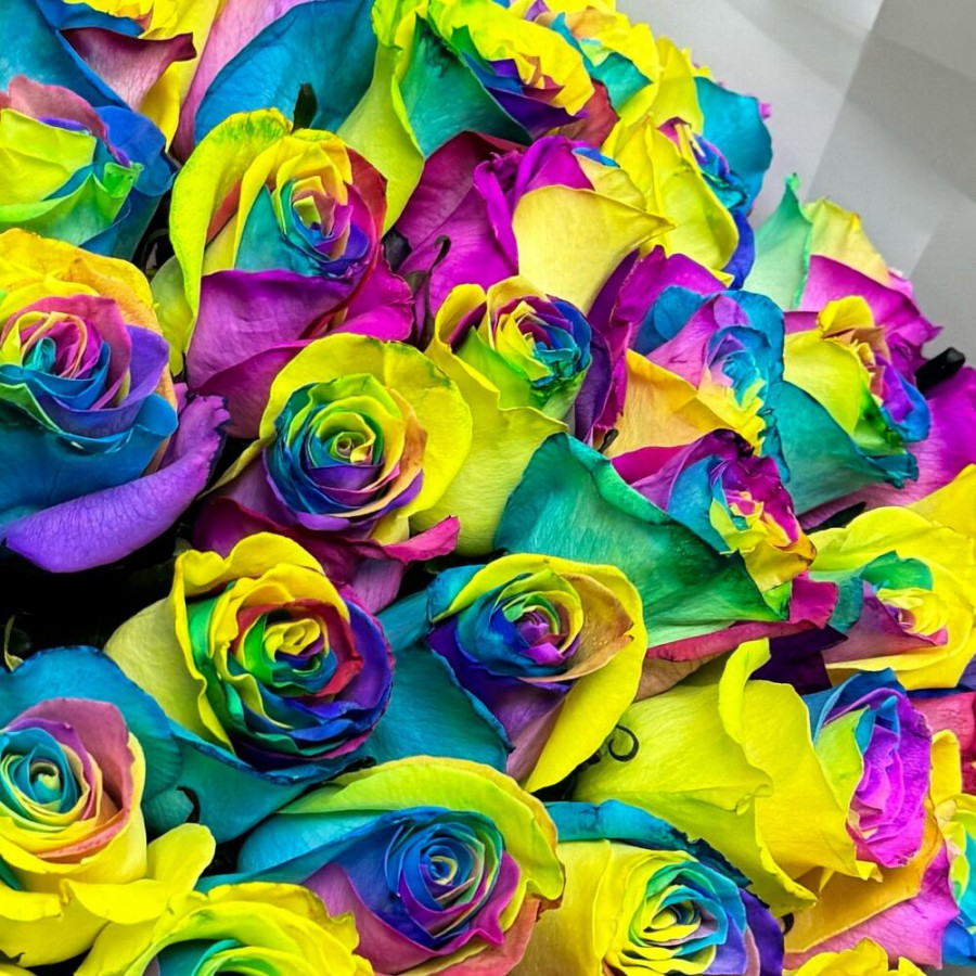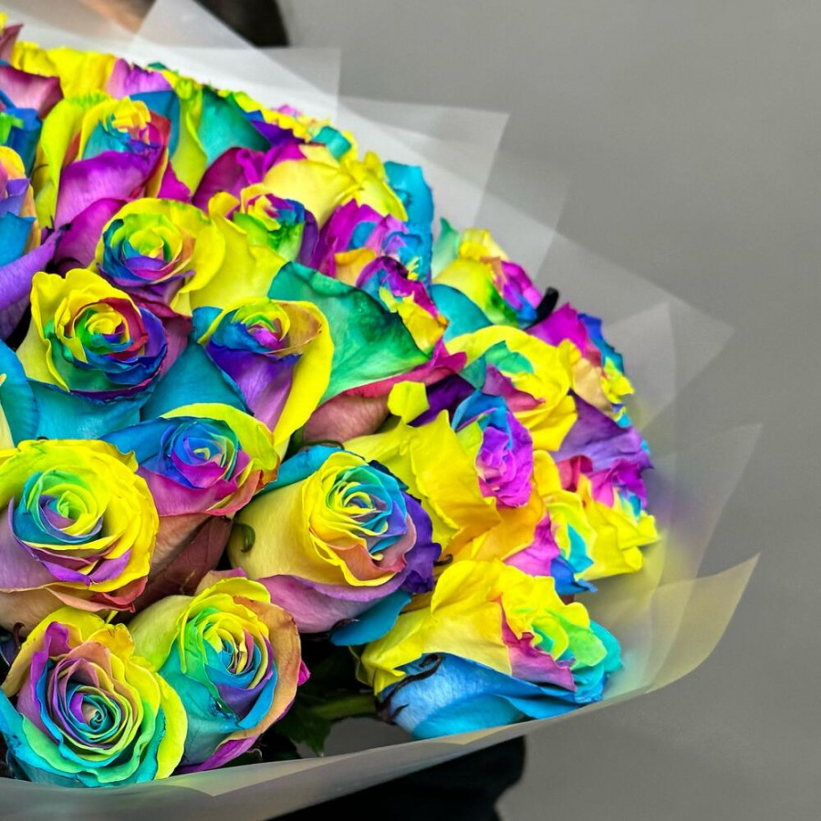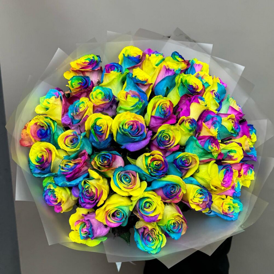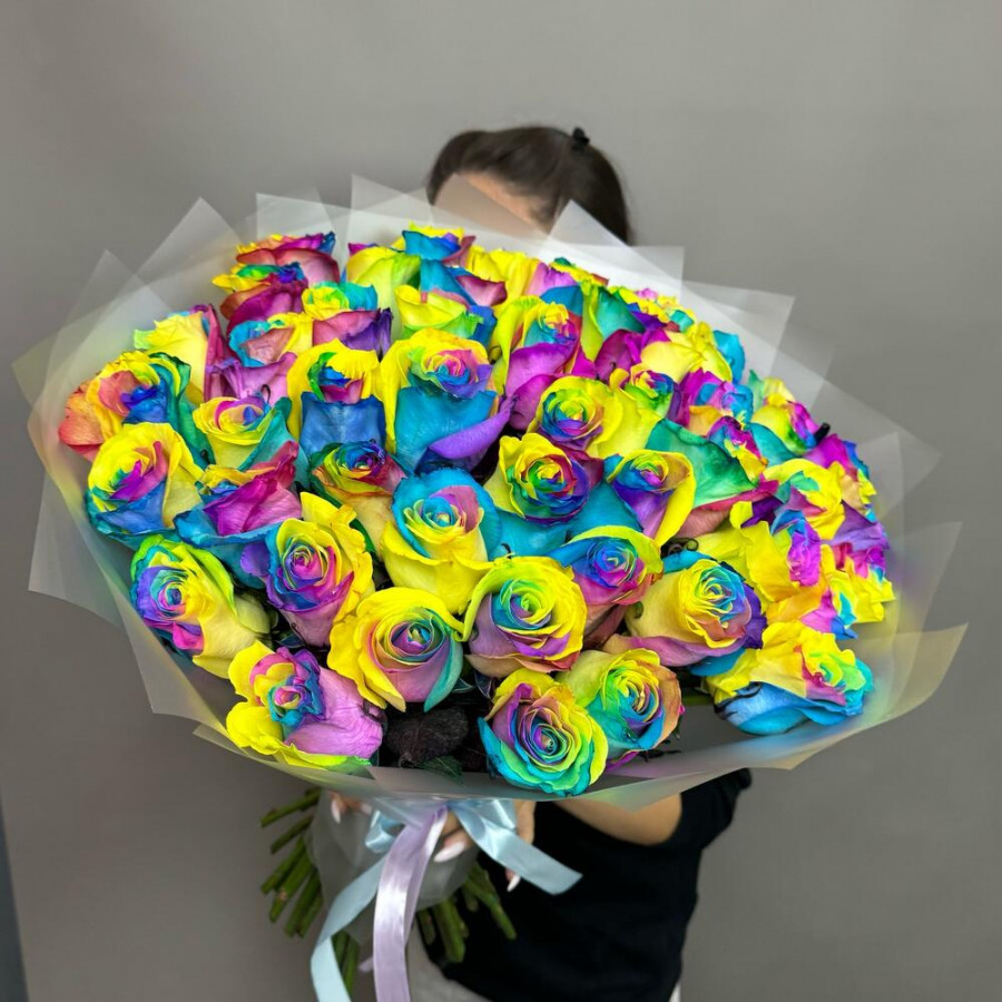 На фото букет из 51 радужных роз. В составе: роза 51 шт, дизайнерская упаковка 2 шт, атласная лента 2 шт, . Все цветы свежие и ароматные, букет красиво оформлен и отлично подходит для подарка. Доступна доставка цветов или самовывоз.