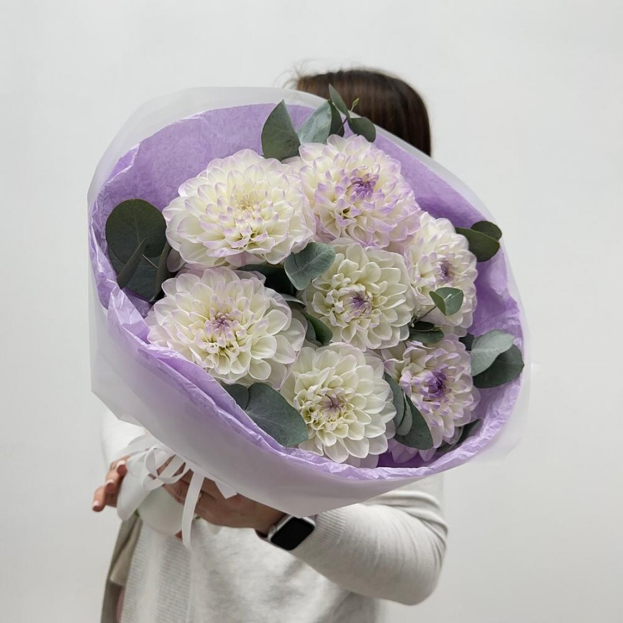 Букет из 7 бело-лиловых георгин с эвкалиптом